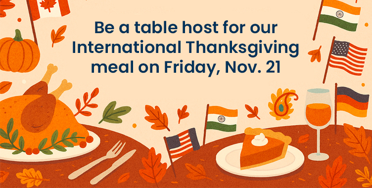 Our First International Ministry is hosting its annual Thanksgiving Dinner on Friday, November 21st and needs American table hosts to welcome internationals from around the world. This event is one of the ministry’s most anticipated gatherings of the year, and your friendly presence can make all the difference. It’s a wonderful opportunity to build cross-cultural friendships and share the joy of Christ’s love—who knows, you might make a lifelong friend in the process!